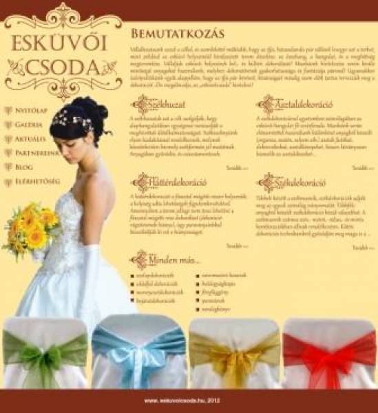 Vállalkozásunk azzal a céllal, és szemlélettel működik, hogy az ifjú, házasulandó pár válláról levegye azt a terhet, mint például az esküvő helyszínéül kiválasztott terem díszítése, az összhang, a hangulat, és a meghittség megteremtése. Vállaljuk esküvői helyszínek bel,- és kültéri dekorálását! Munkáink kivitelezése során kiváló minőségű anyagokat használunk, melyhez dekoratőreink gyakorlatiassága és fantáziája párosul! Ugyanakkor üzletpolitikánk egyik alappillére, hogy az ifjú pár kéréseit, kívánságait mindig szem előtt tartva tervezzük meg a dekorációt…Ön megálmodja, az „esküvőicsoda” kivitelezi!